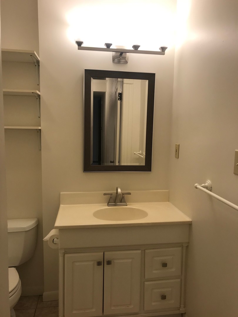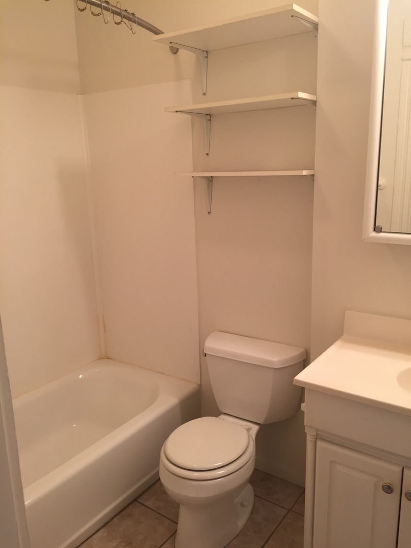 The bathroom in the rear of the apartment has tile floors, full-sized shower/tub combo, and updated fixtures including a curved shower curtain rod.