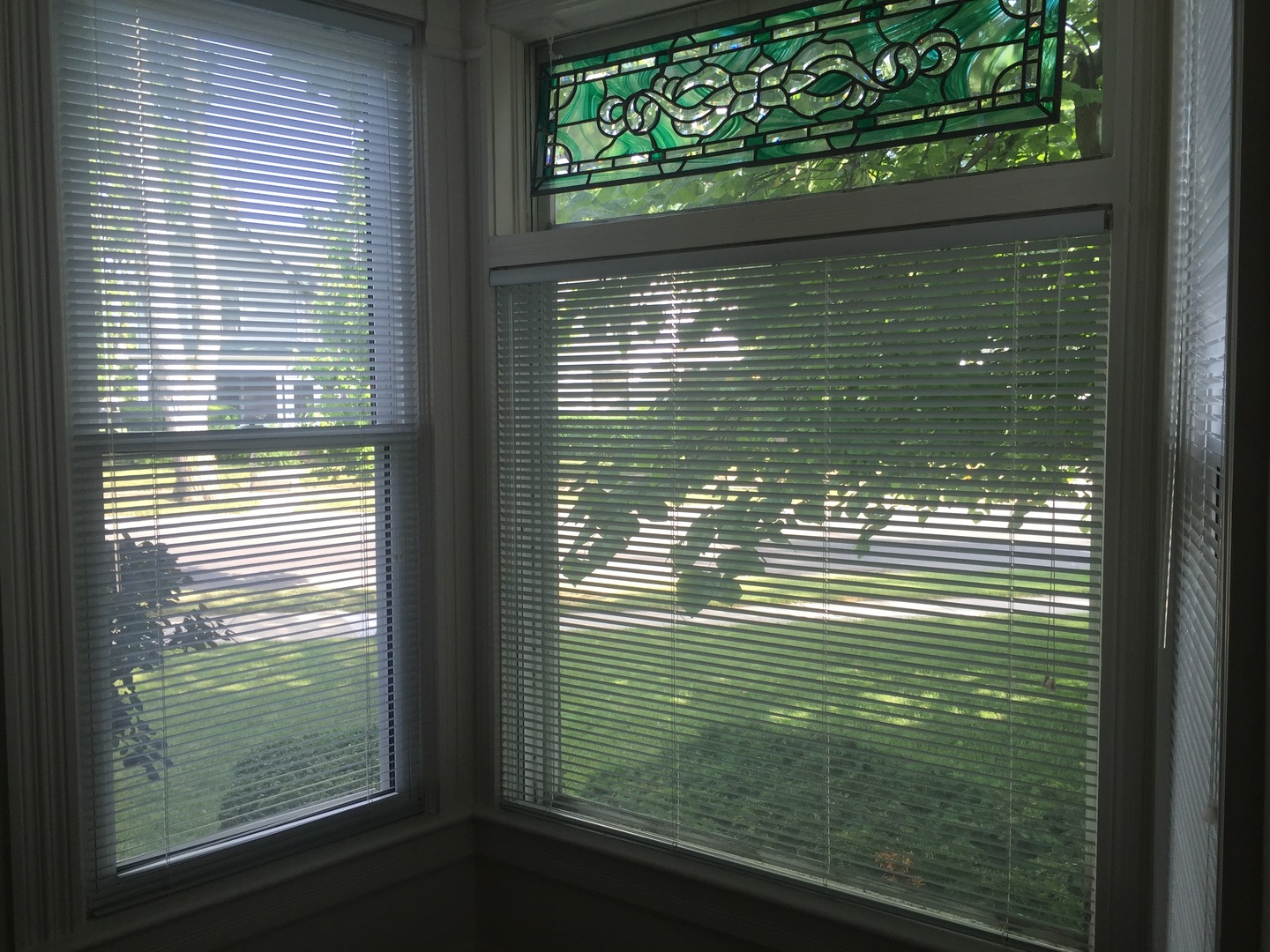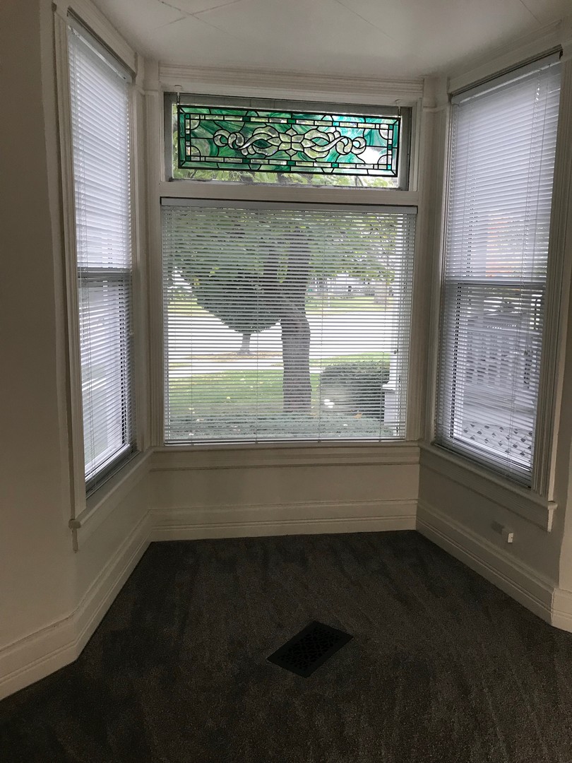 The entrance to the apartment is a secure door off of the front porch. Living room has a historic decorative fireplace as a centerpiece. Two small bedrooms allow flexibility for an office, den, guest room, or extra storage. Both bedrooms have good closets. The front bedroom has beautiful bay windows with a custom stained glass accent, and a built-in air conditioner. Brand new flooring throughout: low-maintenance beautiful wood laminate in the living room and new plush carpet in the bedrooms.