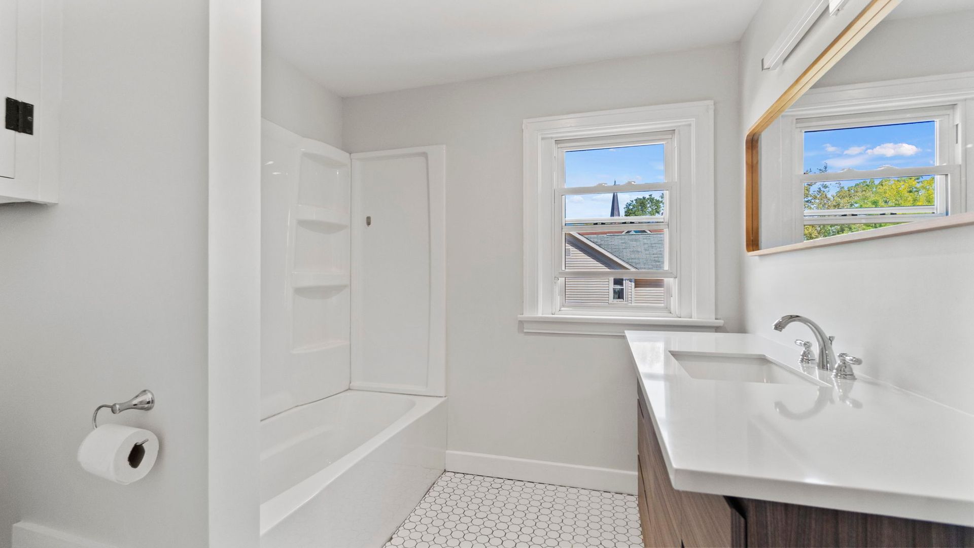 Upstairs there are three full bedrooms and a remodeled bathroom with tile floors, huge vanity, and a tub/shower combination.